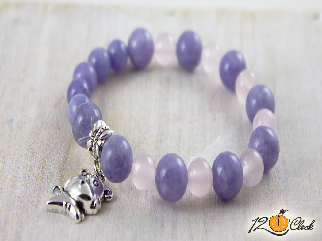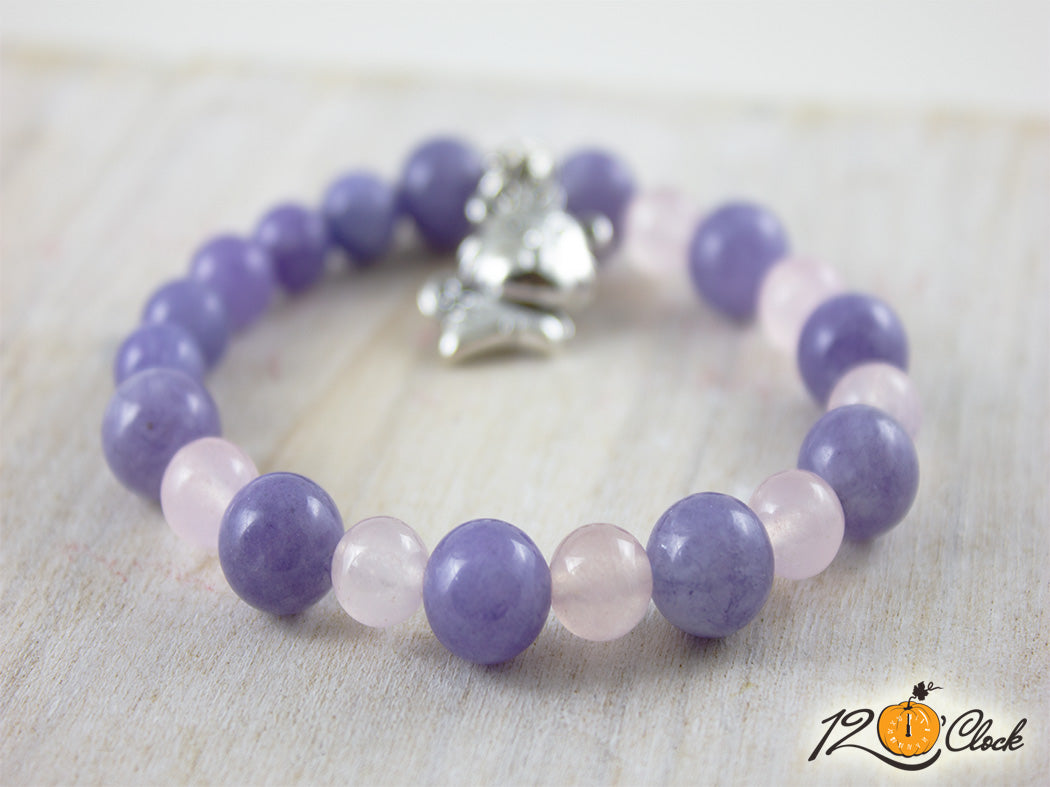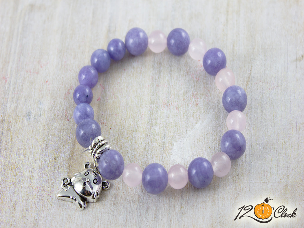 Ръчно изработена гривна с еластична корда, разделител, халка, символ на тигър и камъни в съчетание от розов кварц 8мм и аквамарин в два размера 8мм и 10мм.
