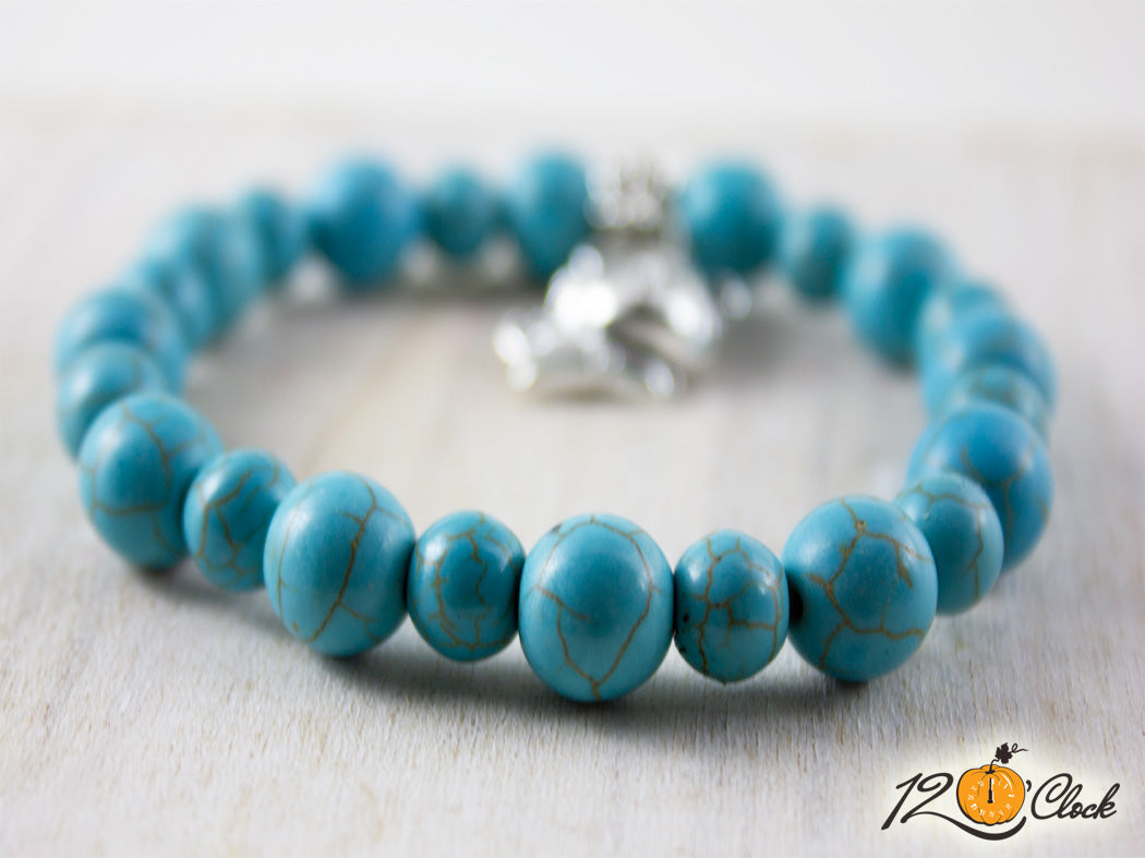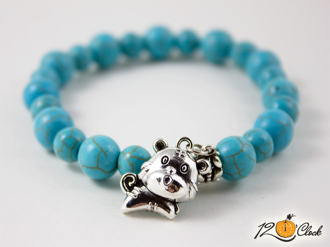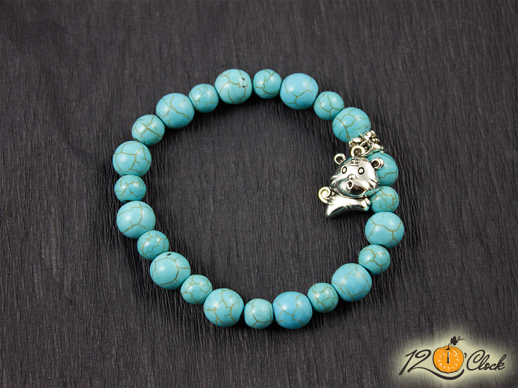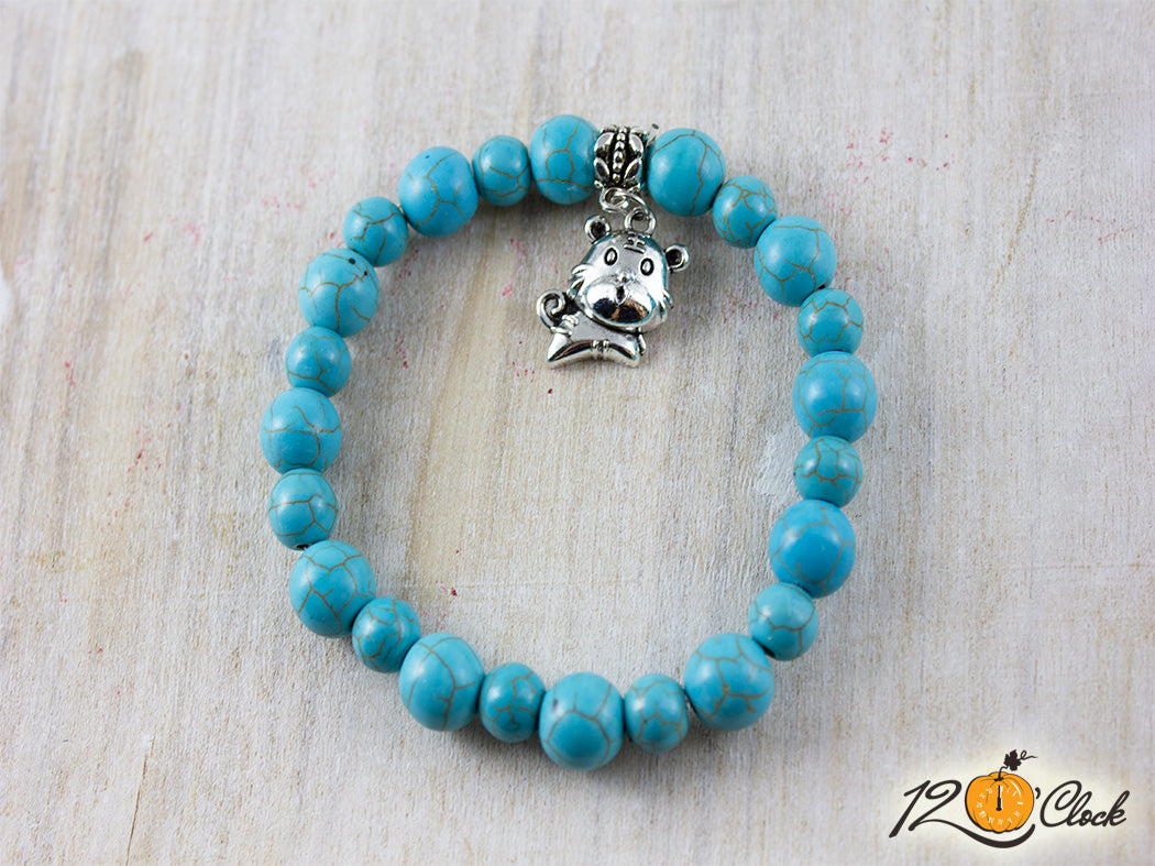 Ръчно изработена гривна с еластична корда, разделител, халка, символ на тигър и камъни в съчетание от тюркоаз в два размера 8мм и 10мм.