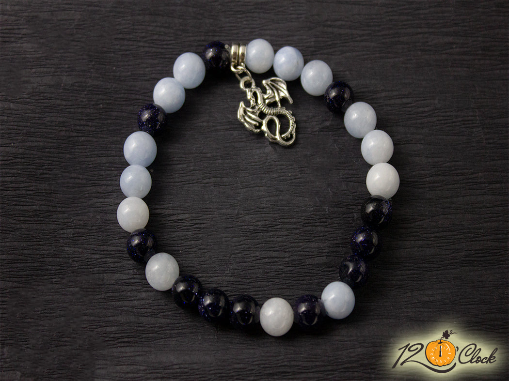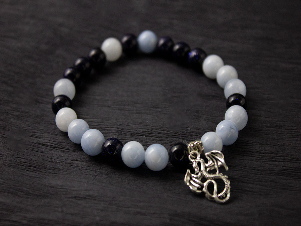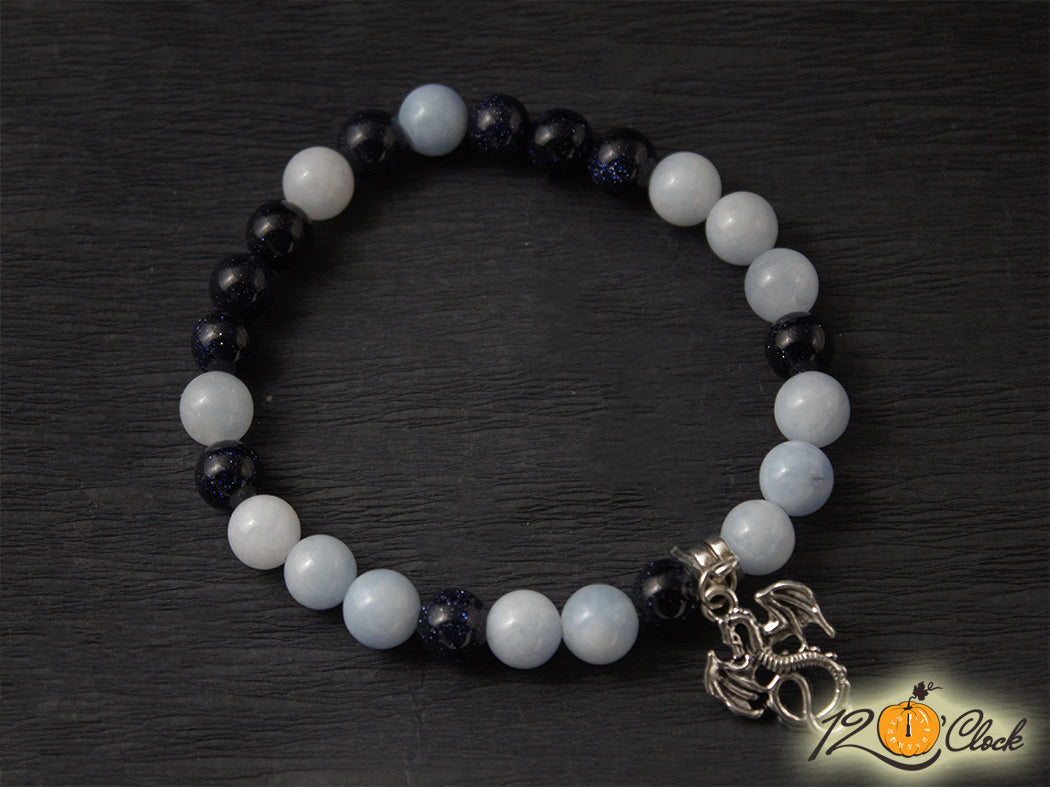 Ръчно изработена гривна с еластична корда, разделител, халка, символ на дракон и камъни от берил 8мм и слънчев камък 8мм