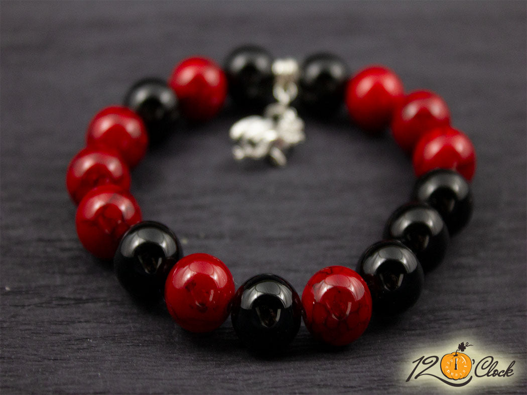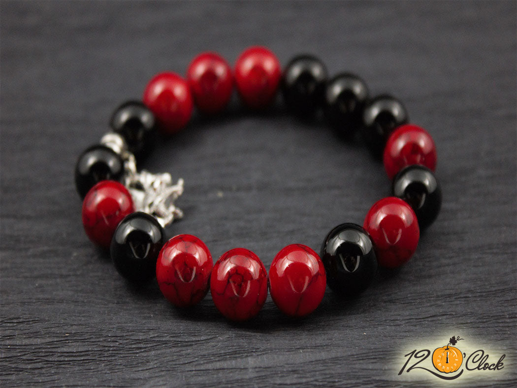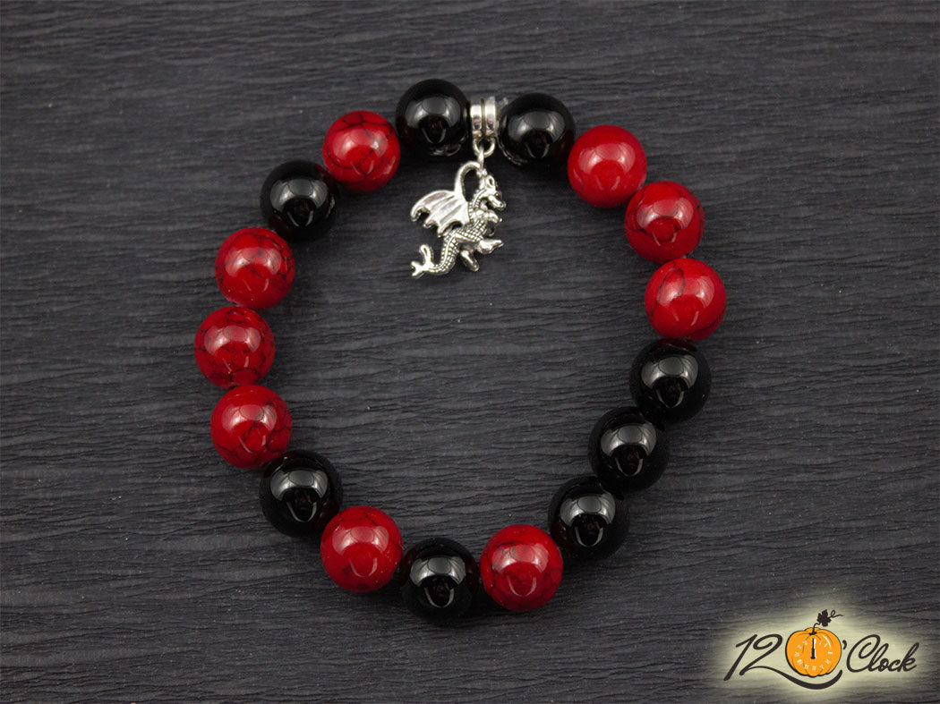 Ръчно изработена гривна с еластична корда, разделител, халка, символ на дракон и камъни от оникс 12мм и червен хаулит 12мм.