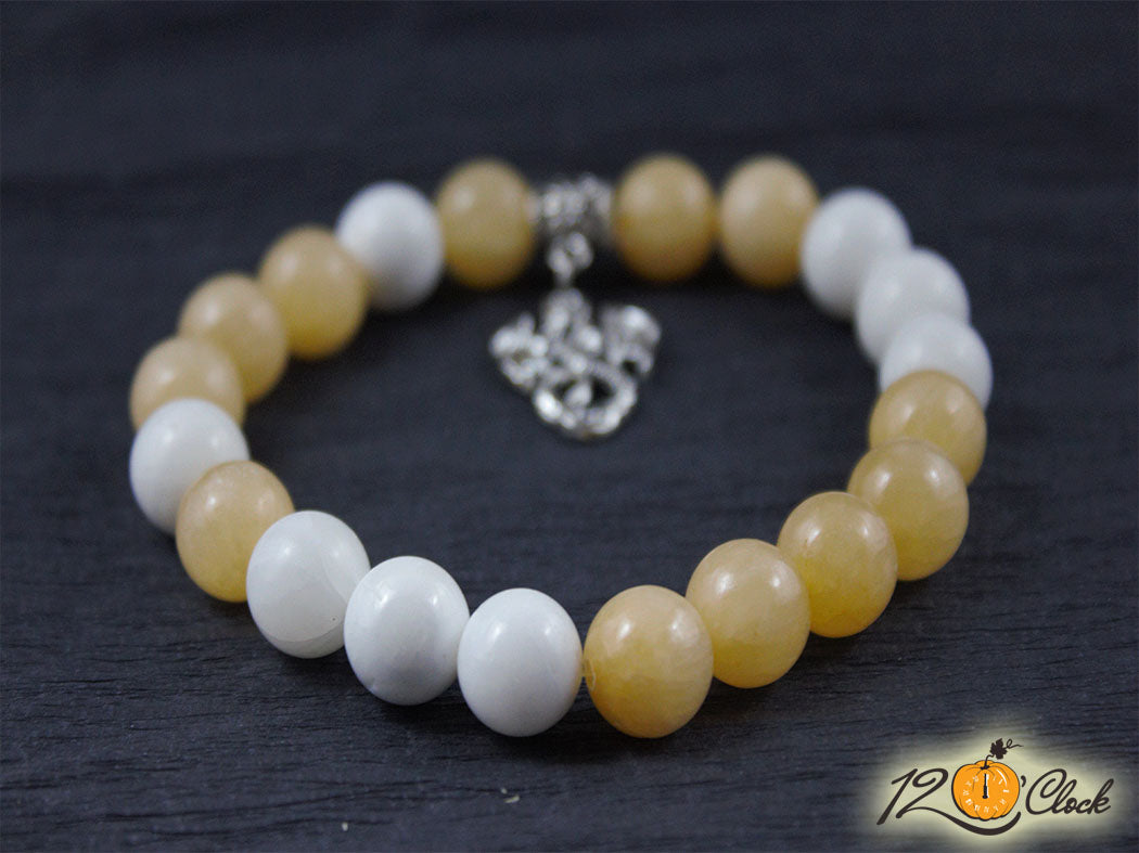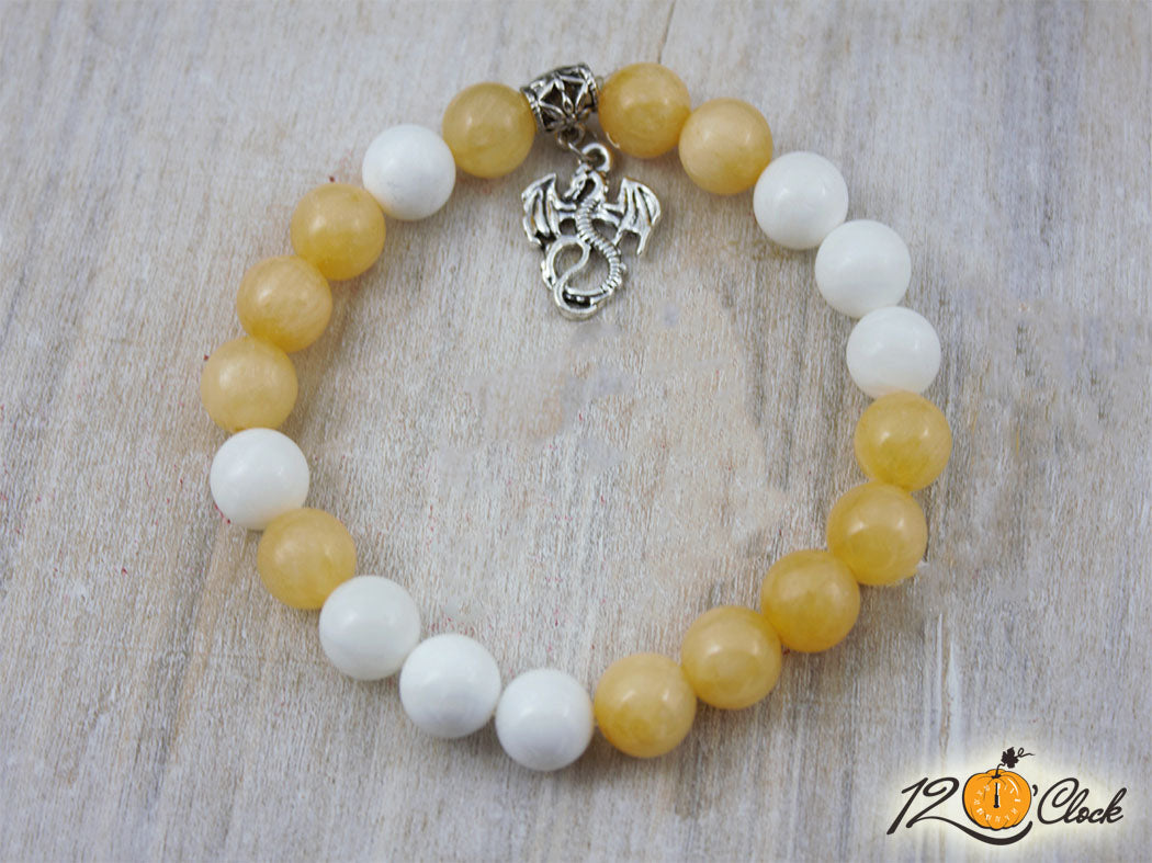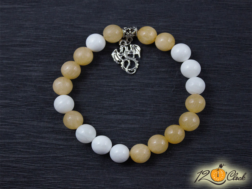Ръчно изработена гривна с еластична корда, разделител, халка, символ на дракон и камъни от бял жадеит 10мм и жълт жадеит 10мм.