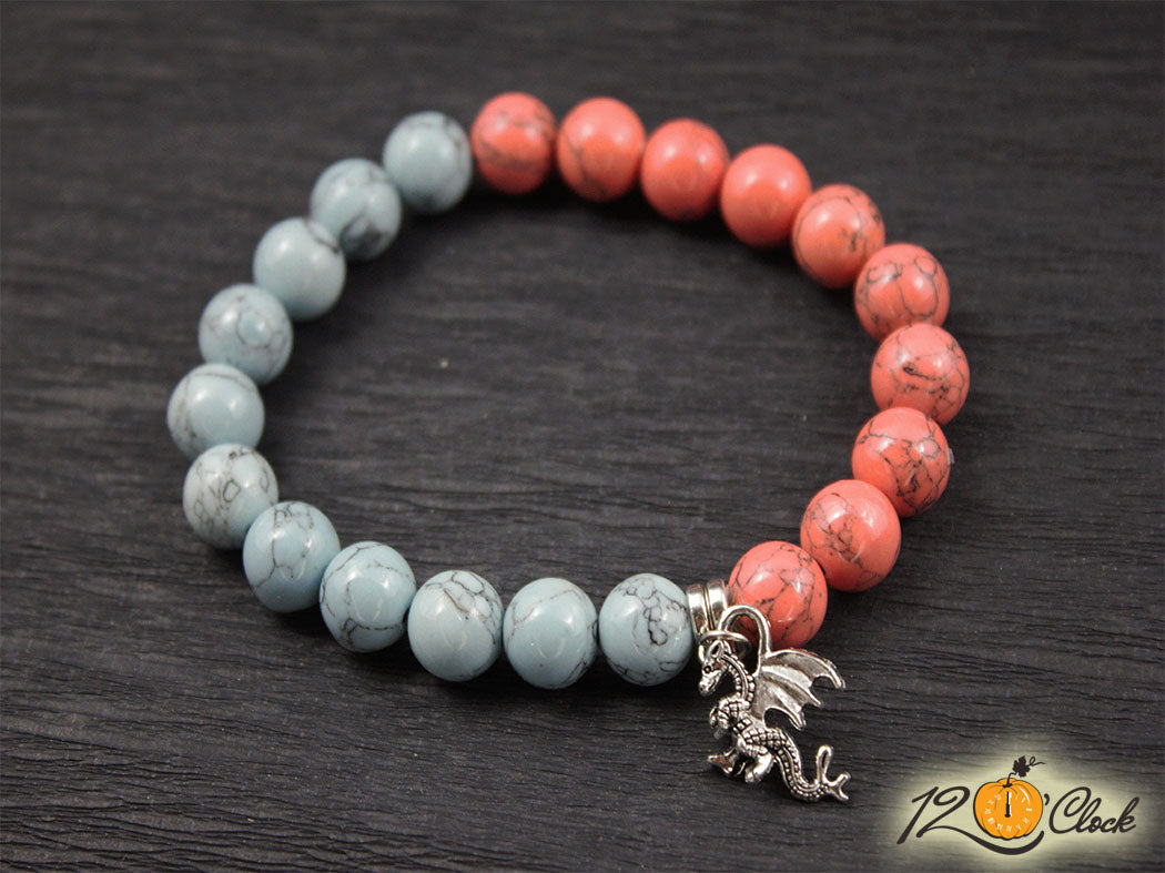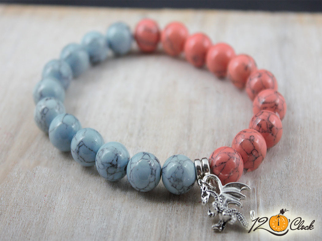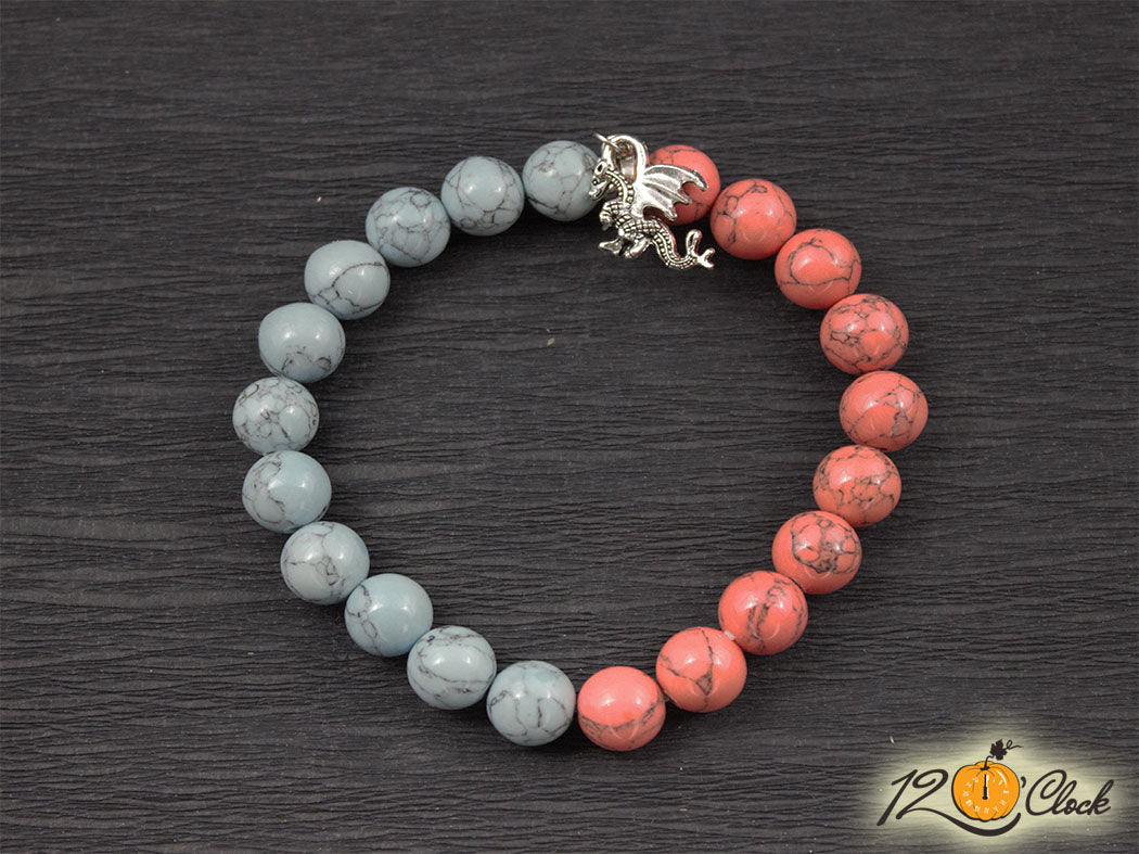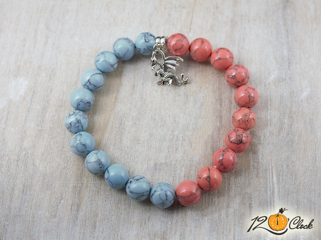 Ръчно изработена гривна с еластична корда, разделител, халка, символ на дракон и камъни от син хаулит 10мм и розов хаулит 10мм.