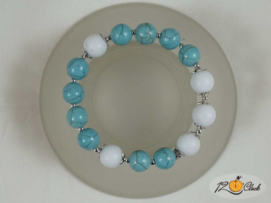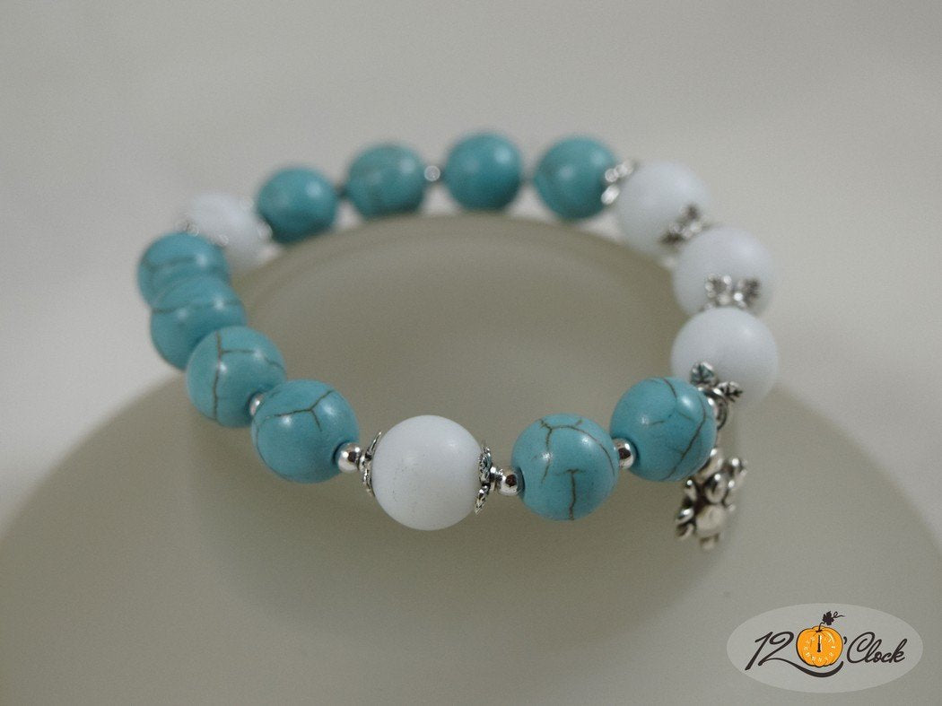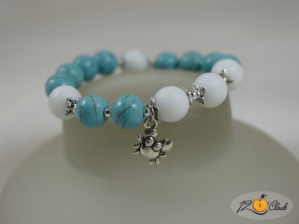 Гривна от син тюркоаз 10 мм, ахат мат 10 мм, комбинирани със сребристи разделители и висулка рак