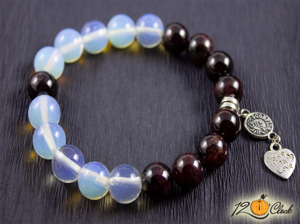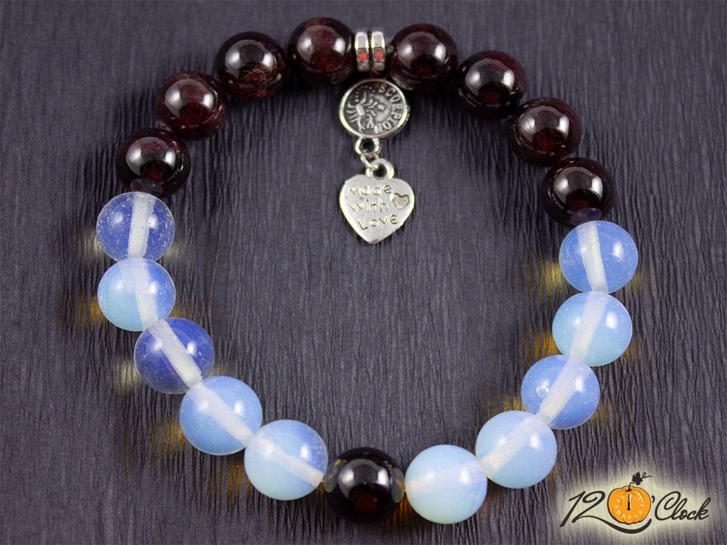 Ръчно изработена гривна от еластична корда, разделител, халки сърце и зодия, в комбинация от гранат 10 мм и лунен камък 10 мм.