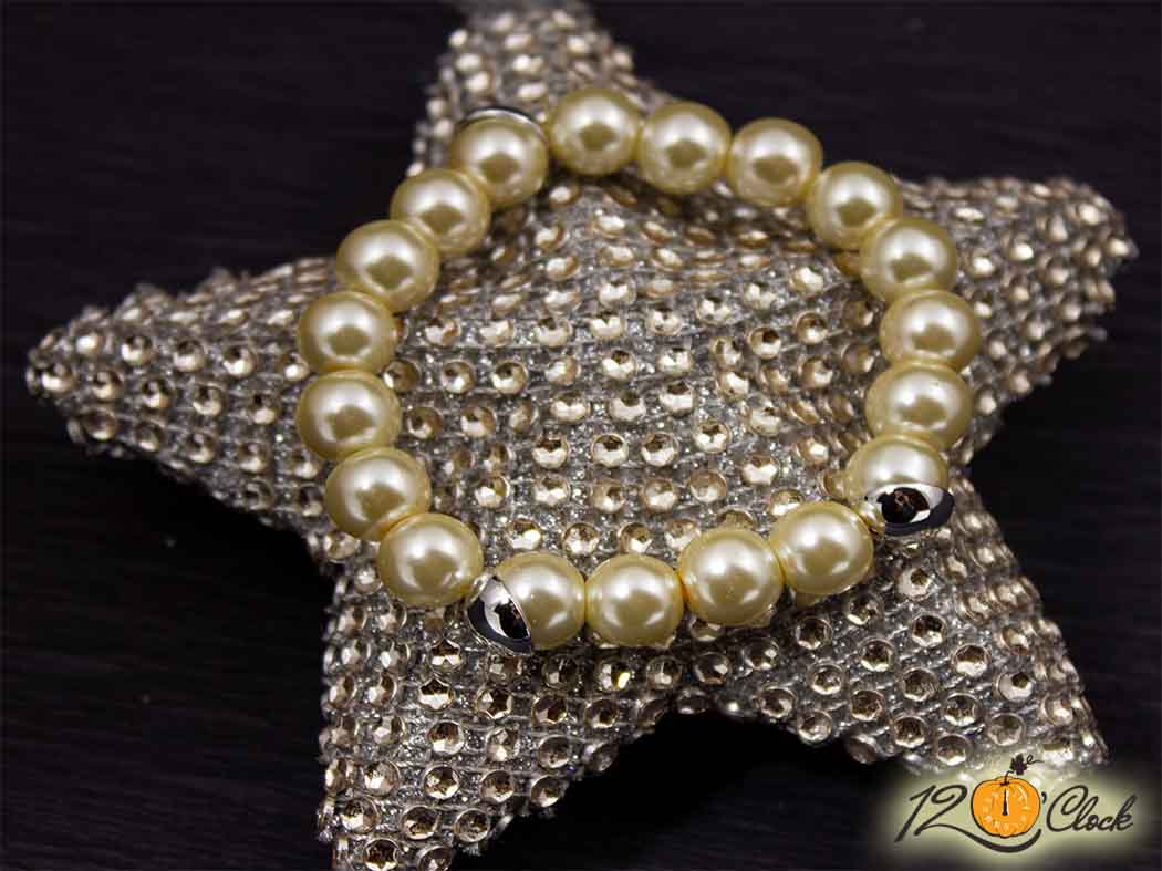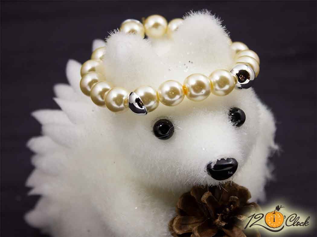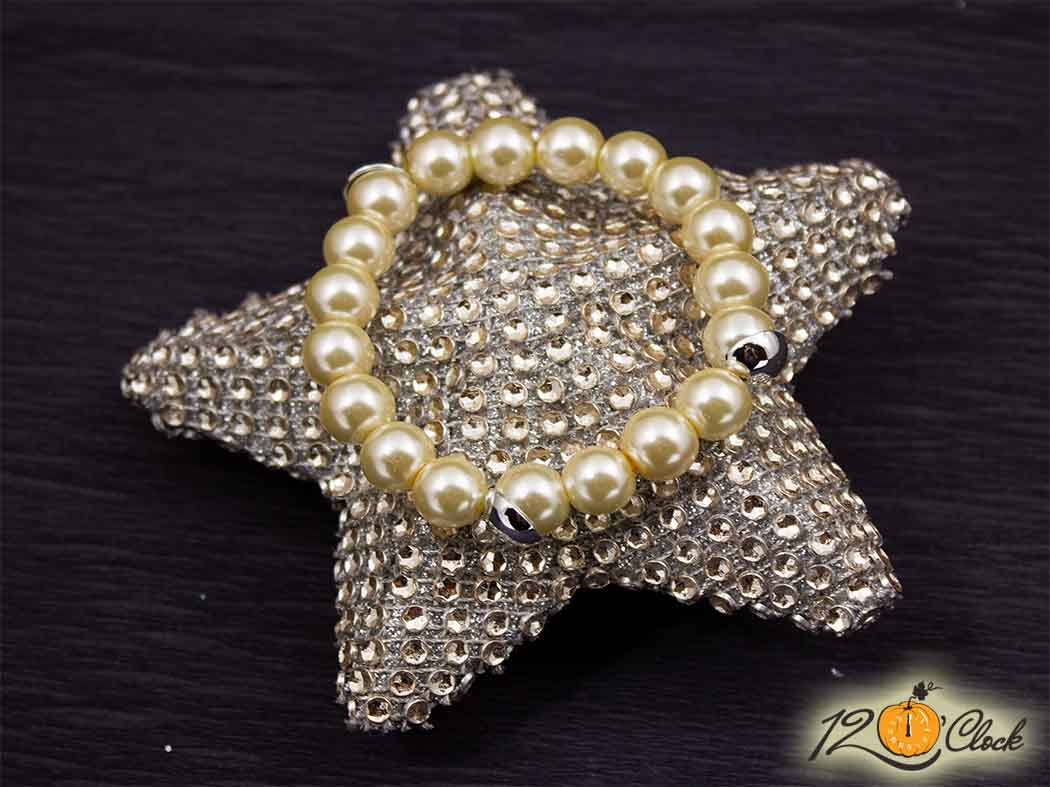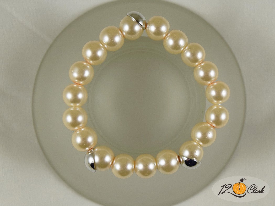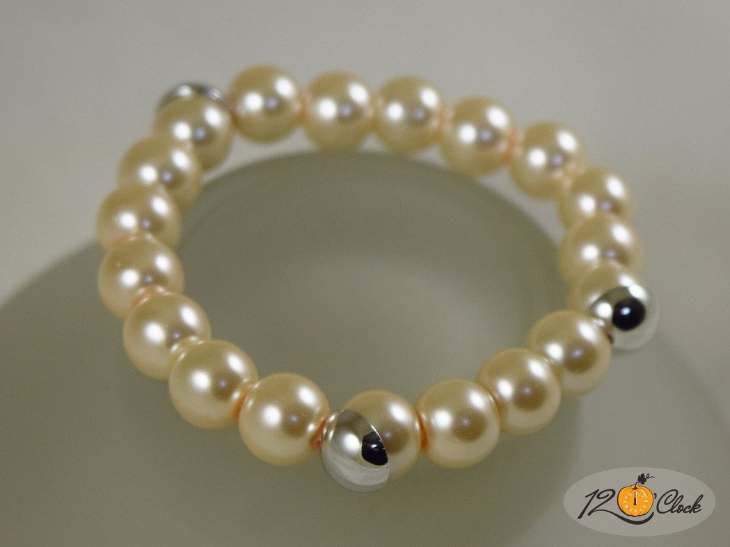 Нежна гривна от стъклени перли 10 мм, в кремаво, декорирани със сребристи шапки