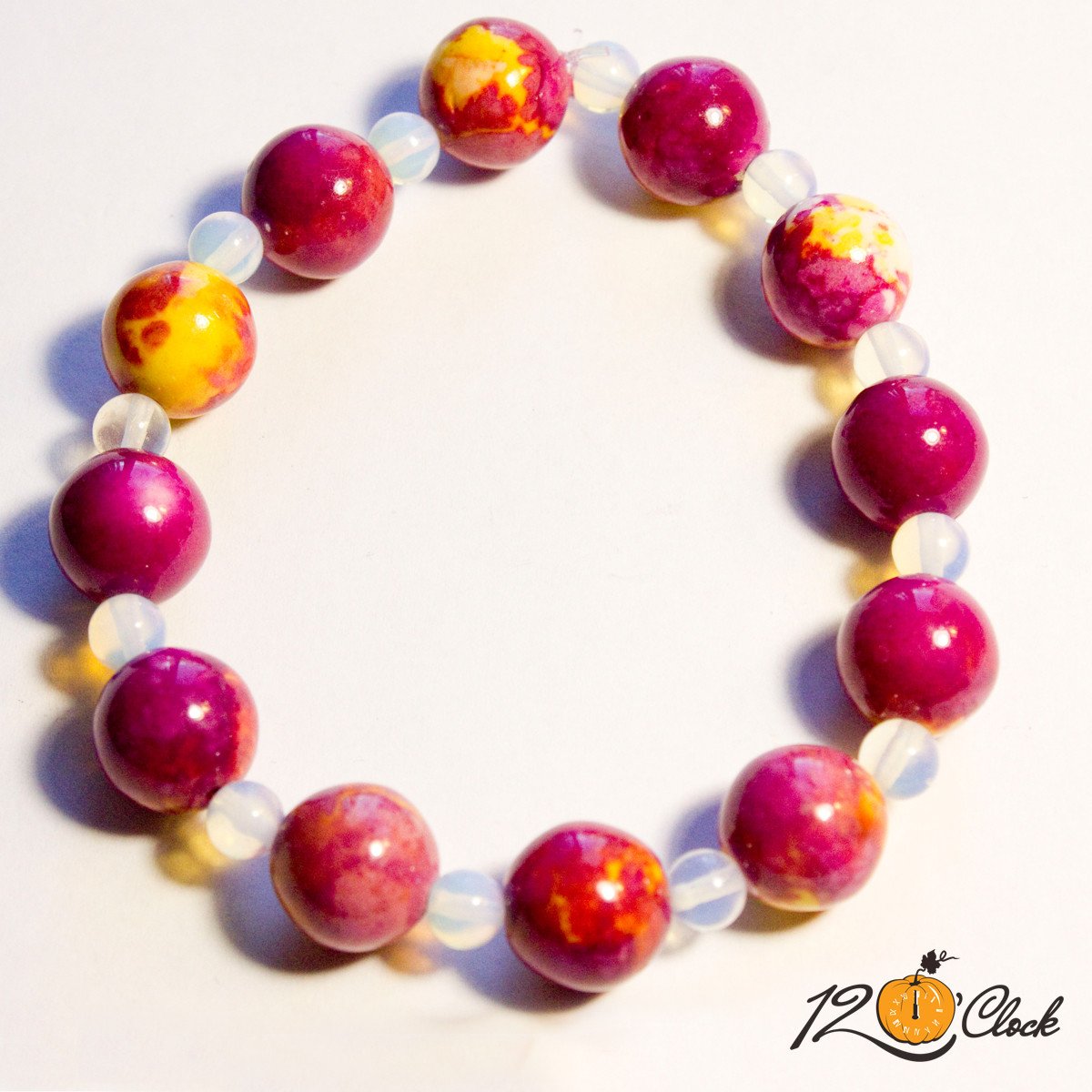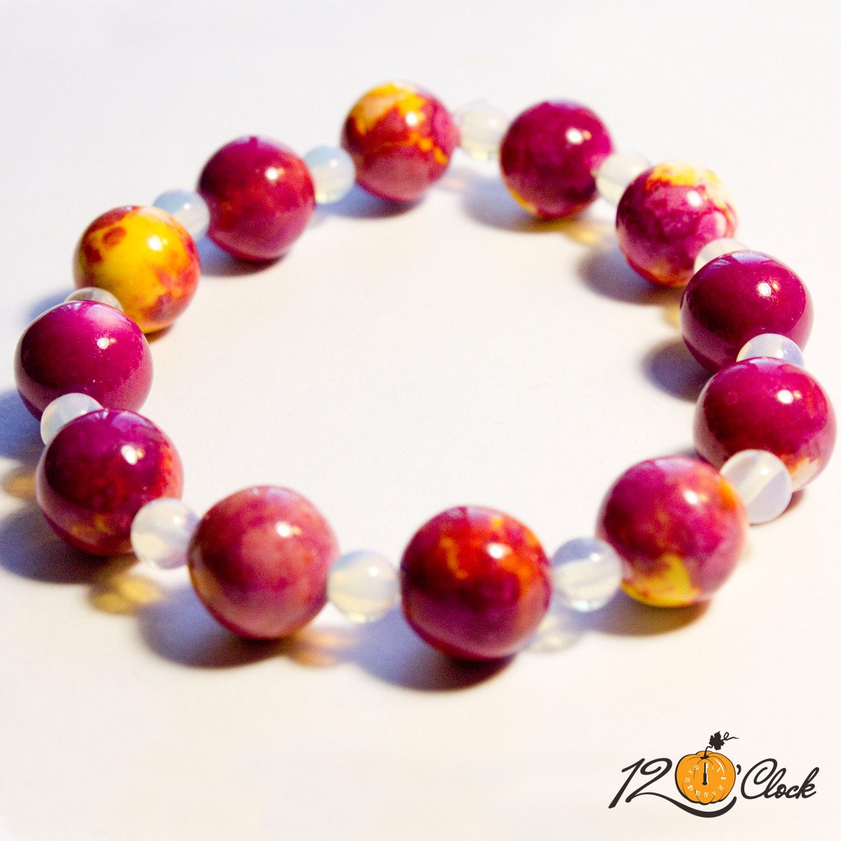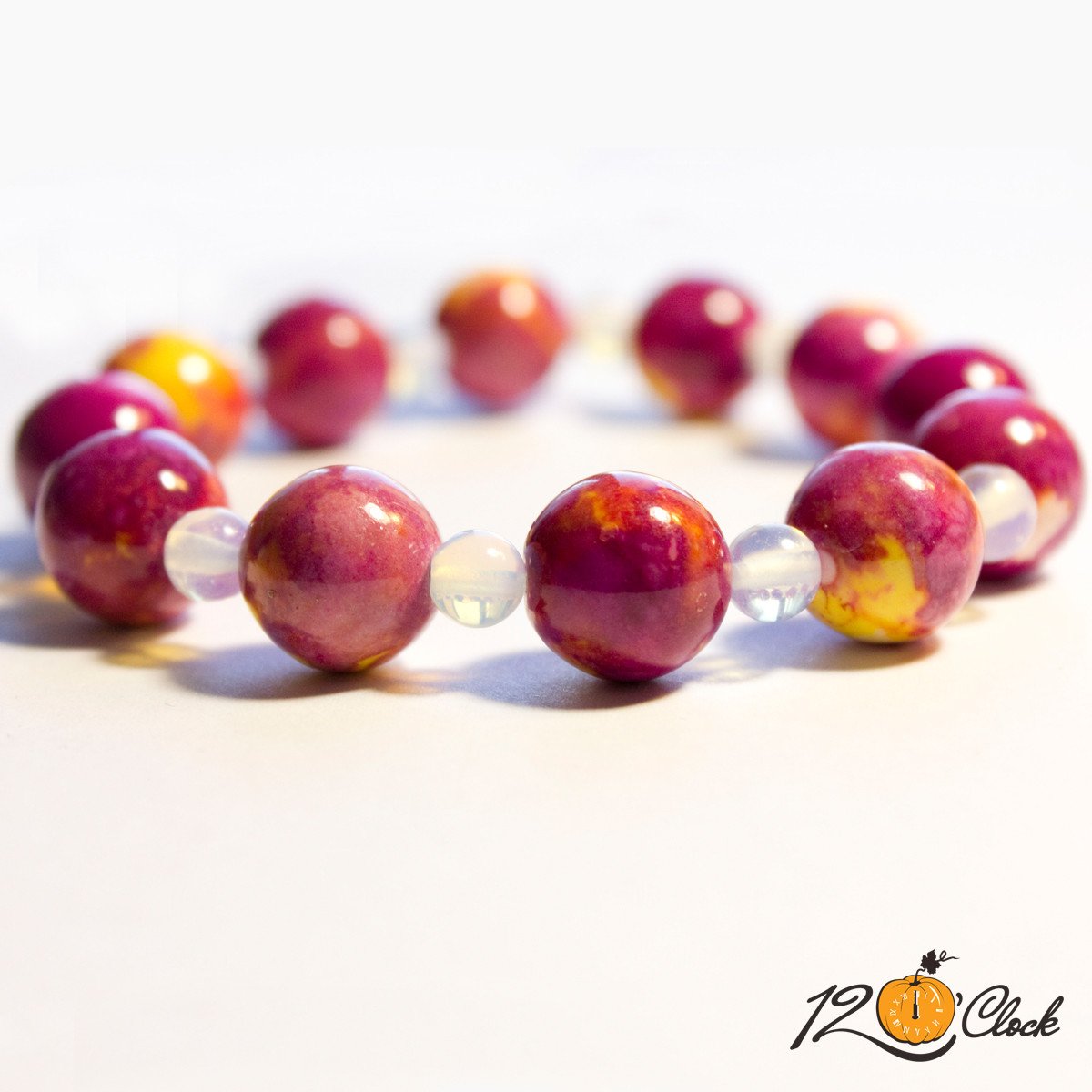 Ръчно изработена гривна с основа еластична корда с мукаит 12 мм и лунен камък 6 мм