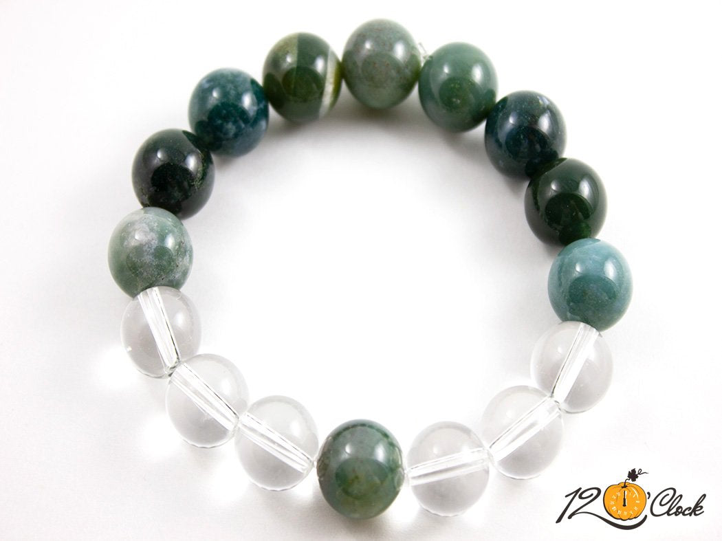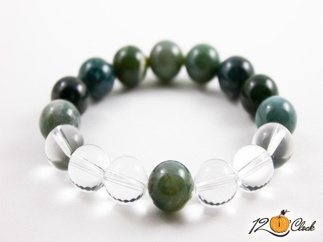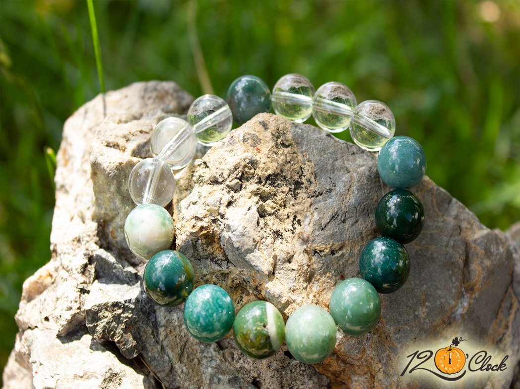 Ръчно изработена гривна от еластична корда, в комбинация от зелен ахат 12 мм и планински кристал 12 мм.