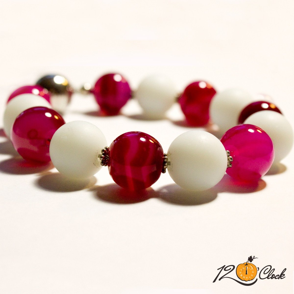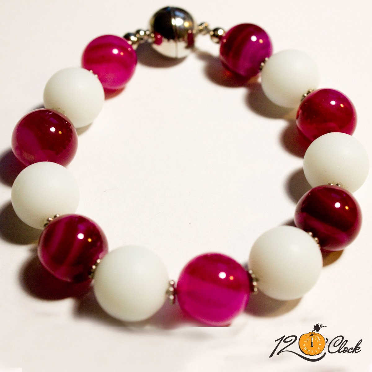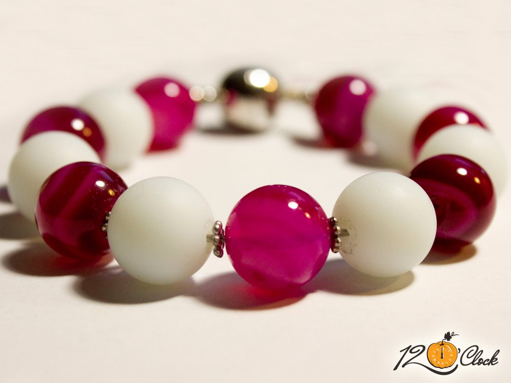 Гривна с метална основа и комбинация от розов ивчест ахат 12 мм и бял ахат мат 12 мм. За допълнителен блясък и баланс със закопчалката са добавени и сребристи разделители