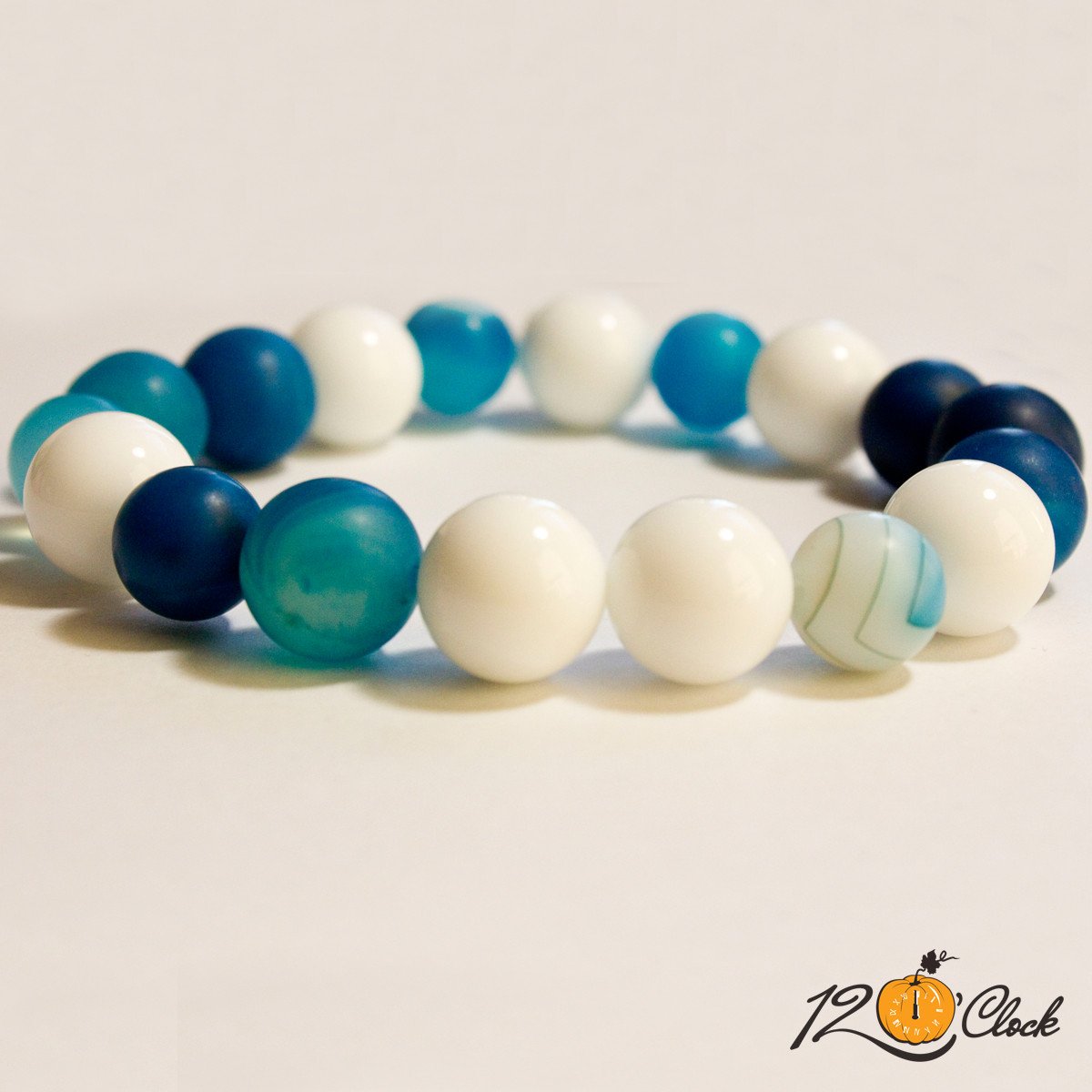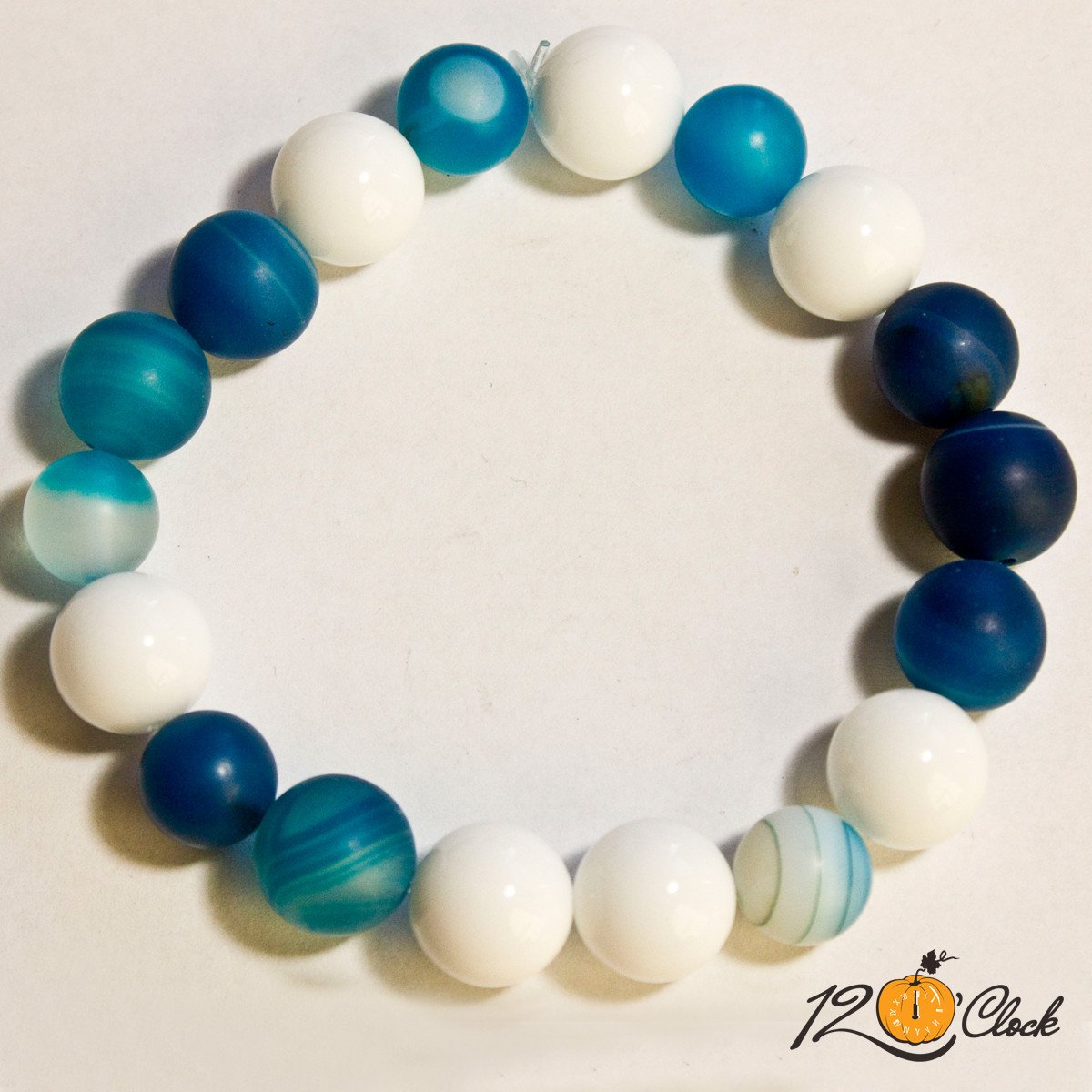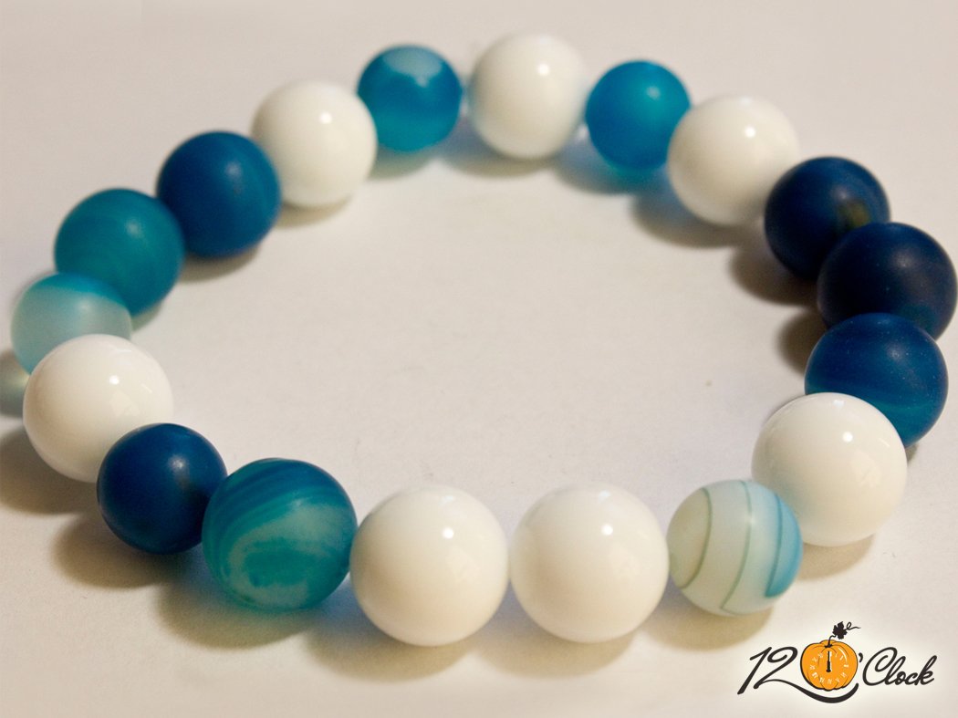 Ръчно изработена гривна с основа от еластична корда със син ивчест ахат мат 12 и 10 мм и бял ахат 12 мм