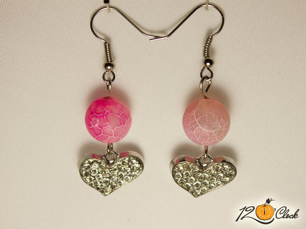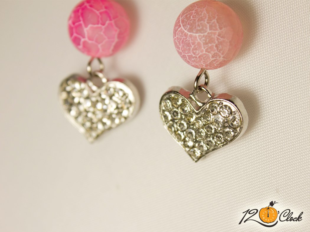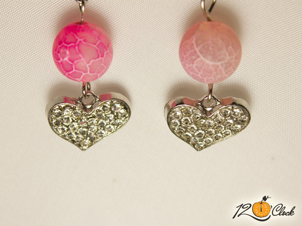 Ръчно изработени обици с напукан розов ахат и бляскави сърца