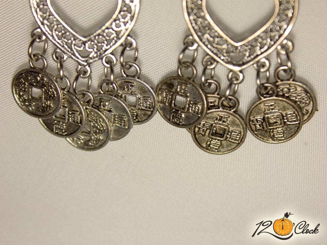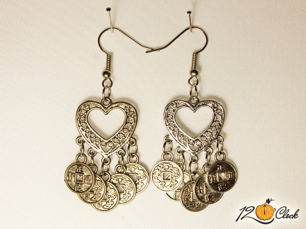 Ръчно изработени обици с мистична ориенталска визия. Основата на обиците е от голямо сребристо сърце, което е комбинирано с малки сребристи пендари