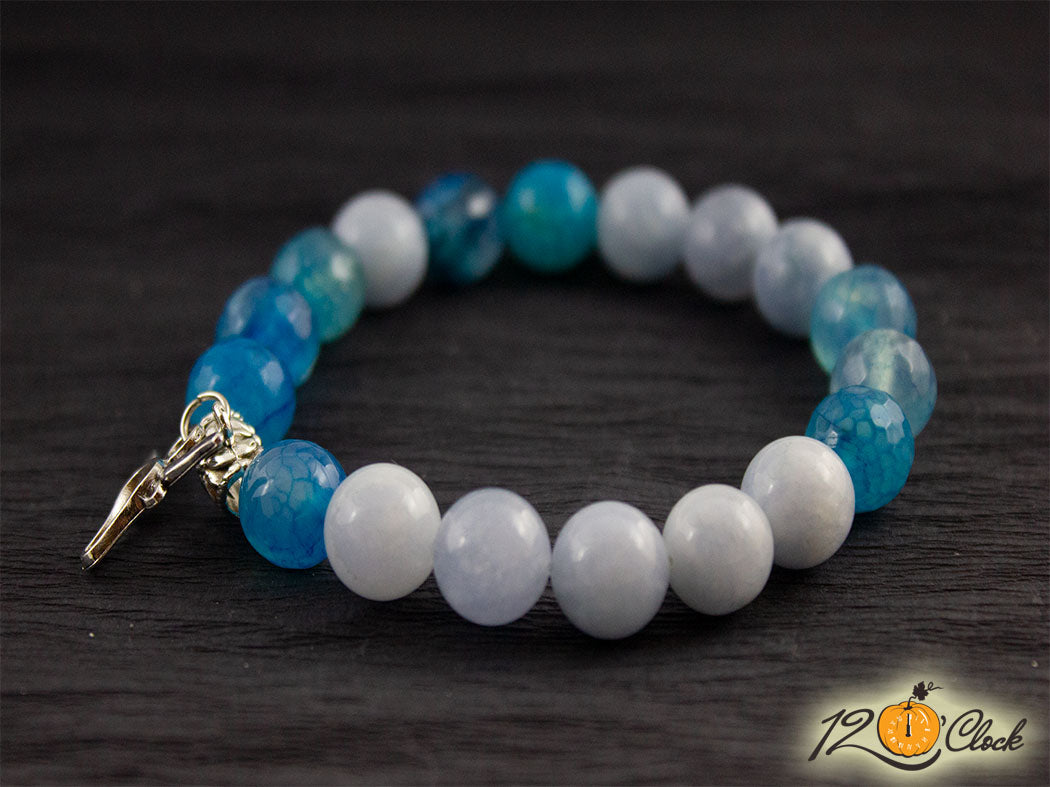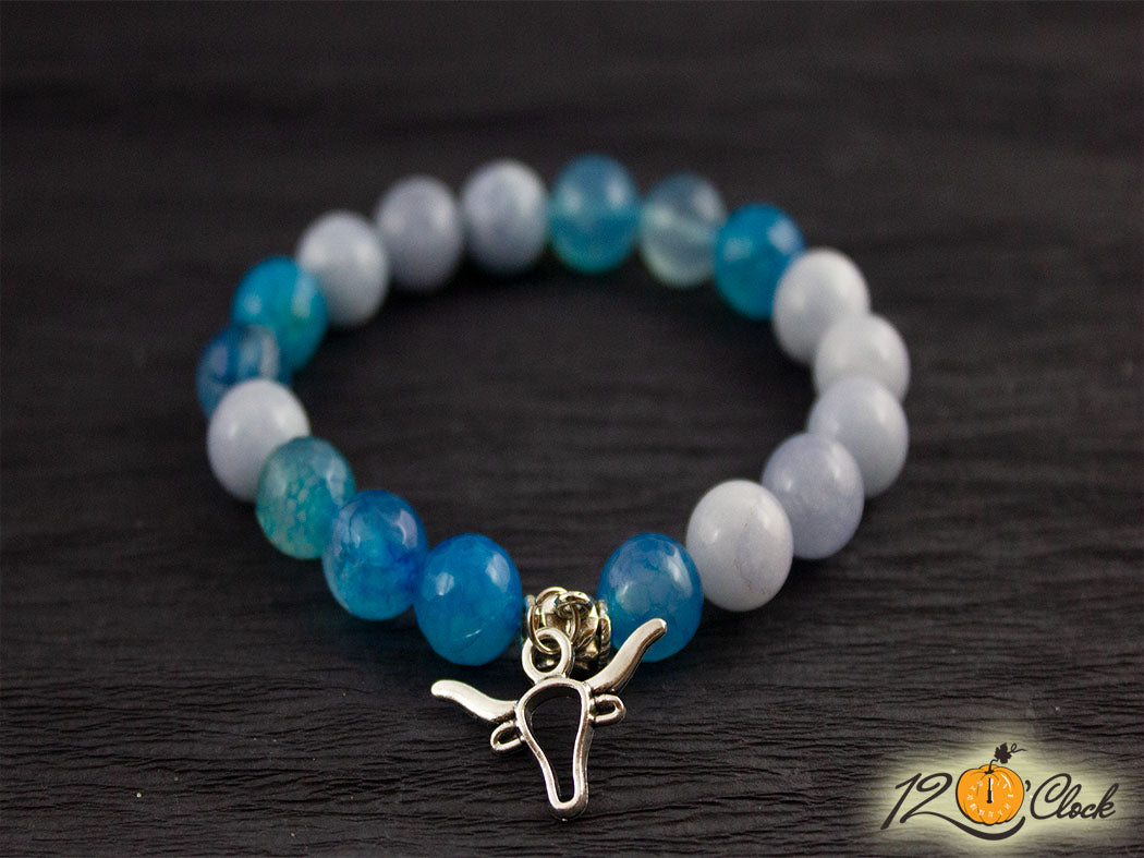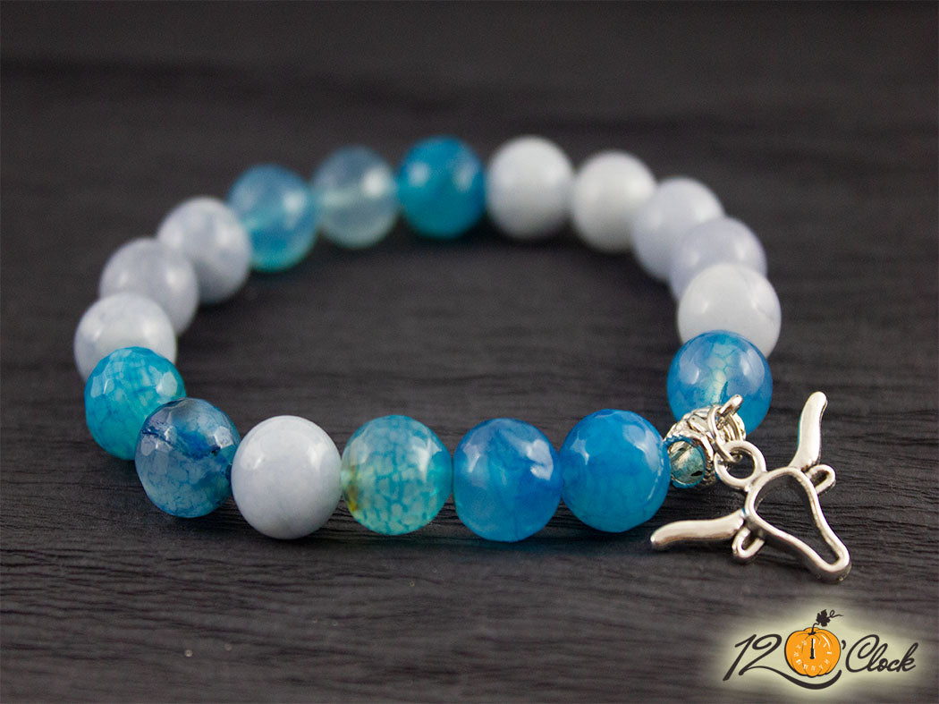 Ръчно изработена гривна с основа еластична корда и камъни от син 10 мм и бял ахат 10мм. Към камъните има добавена висулка със символ на бик.